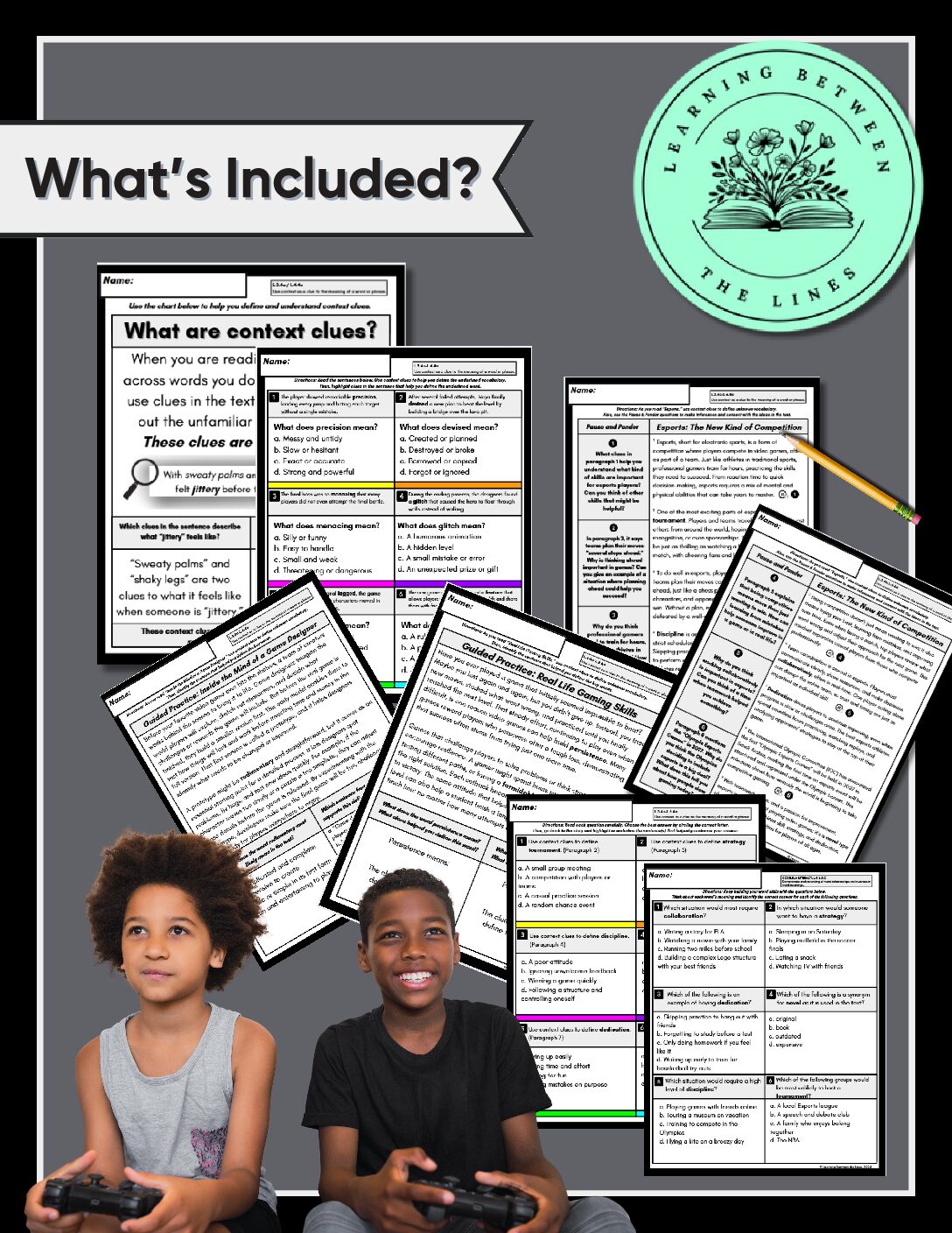 ⭐ Perfect for Grades 3–5, with built-in flexibility for 2nd grade enrichment and 6th grade remediation, this resource helps students strengthen their ability to determine word meanings using context clues while building background knowledge about video games and esports.